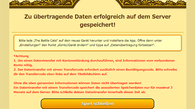 5. Nach der Bestätigung, dass deine Daten erfolgreich auf dem Server gespeichert wurden, zeichne bitte deinen Transfercode und deinen Bestätigungscode auf. Nachdem du genau überprüft hast, dass du deine Codes korrekt aufgeschrieben hast, tippe auf die Schaltfläche „Spiel beenden“.
