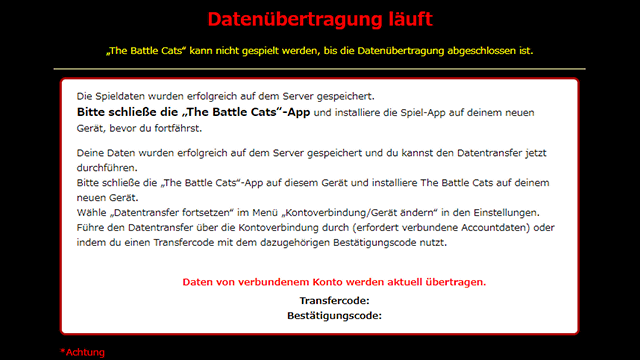 * Um einen Datentransfer mit Kontoverbindung durchzuführen, sind Informationen vom verbundenen Konto nötig. Ohne Übertragungs- und Bestätigungscode kann der Datentransfer zu deinem neuen Gerät nicht fortgesetzt werden. Notiere alle Ziffern gewissenhaft und fertige einen Screenshot der Codes an, um die Speicherdaten empfangen zu können.