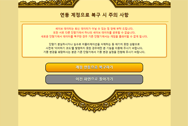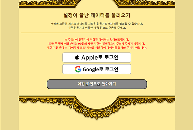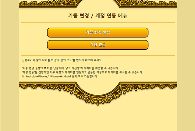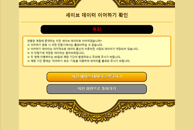 ※ 기존 단말기에서는 게임을 플레이할 수 없게 되며 데이터를 이어받은 단말기의 기존 세이브 데이터는 초기화됩니다.