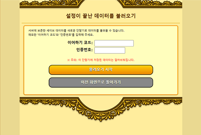 ※ 어떠한 문제로 인해 세이브 데이터가 정상적으로 이전되지 않은 경우에도 당사는 일절 책임을 지지 않으며 어떠한 보증도 하지 않습니다.