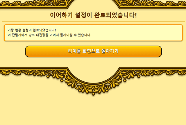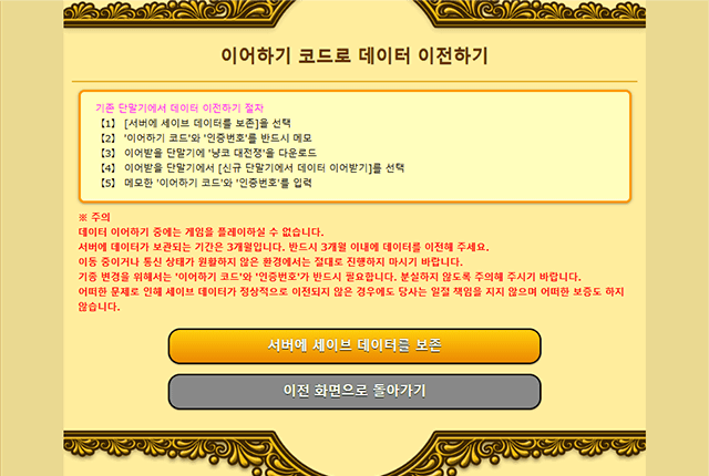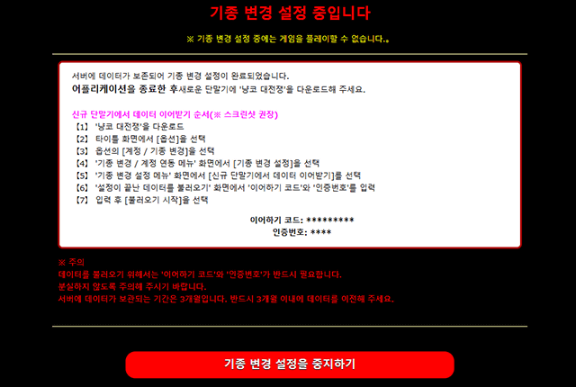 ※ 이어받기가 완료되면 기존 단말기의 게임 데이터는 초기화됩니다.