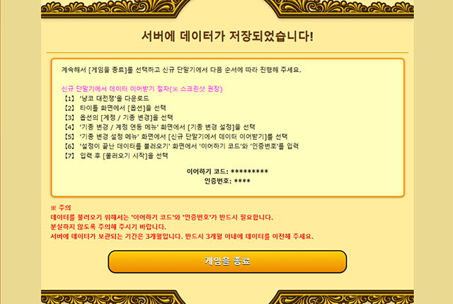 6. 서버에 데이터가 정상적으로 보존되었는지 확인하신 후 화면에 표시되는 [이어하기 코드]와 [인증번호]를 반드시 메모해 주세요. 메모하신 후에 [게임을 종료]를 선택해 주세요.
