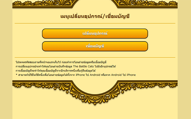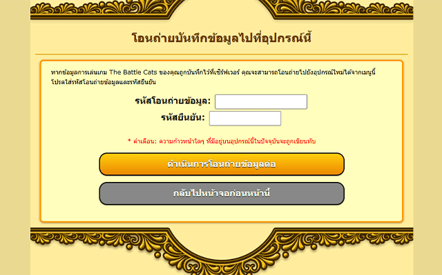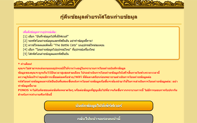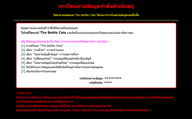 ※ ข้อมูลจากเกม The Battle Cats เวอร์ชันภาษาอังกฤษไม่สามารถโอนถ่ายไปยังเกมเวอร์ชันภาษาอื่นได้
