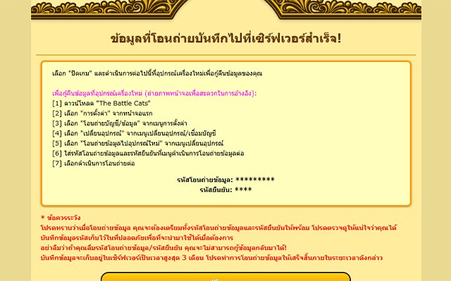※ รหัสโอนถ่ายข้อมูลและรหัสยืนยันที่แสดงขึ้นหลังการโอนถ่ายข้อมูลเริ่มขึ้นจะต้องนำมาใช้ในการดำเนินการโอนถ่ายข้อมูลต่อ: อย่าทำข้อมูลนี้หาย PONOS จะไม่รับผิดชอบต่อข้อผิดพลาดใดๆ