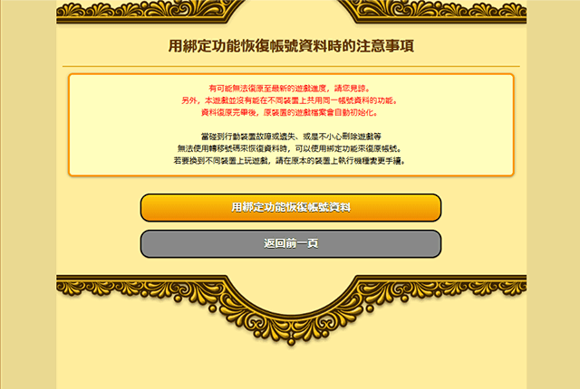 5. 在「用綁定功能恢復帳號資料時的注意事項」畫面確認完內容後,選擇「用綁定功能恢復帳號資料」。