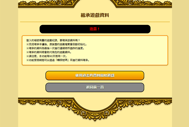 7. 在「繼承遊戲資料」確認完內容後,選擇「使用過去的資料開始遊戲」。