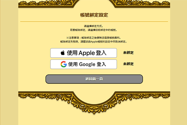 5. 在「帳號綁定設定」畫面確認完內容後,選擇「使用Apple登入」或「使用Google登入」。