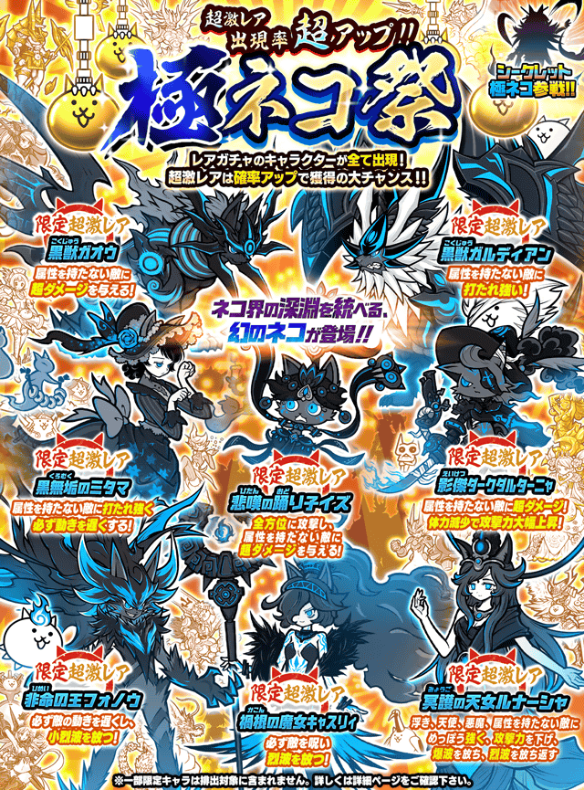 ※上記の各キャラクターにつきましては、ガチャイベント実施期間中にレアガチャから所定の確率で排出されます。必ずしも超激レアキャラクターが排出されるとは限りませんので、あらかじめご了承ください。