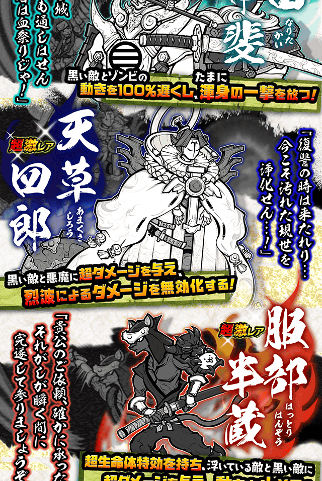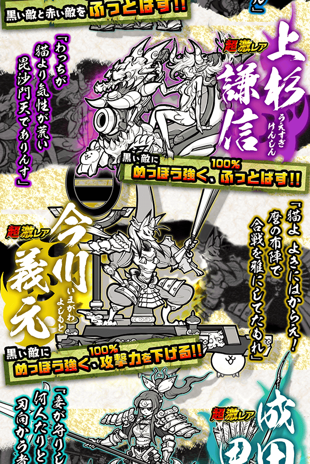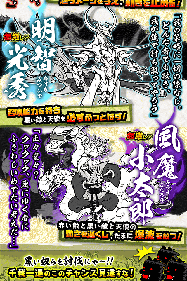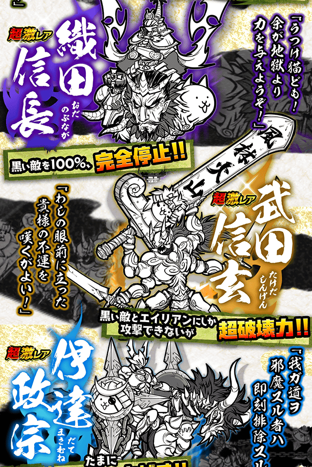 ※上記の各キャラクターにつきましては、ガチャイベント実施期間中にレアガチャから所定の確率で排出されます。必ずしも超激レアキャラクターが排出されるとは限りませんので、あらかじめご了承ください。