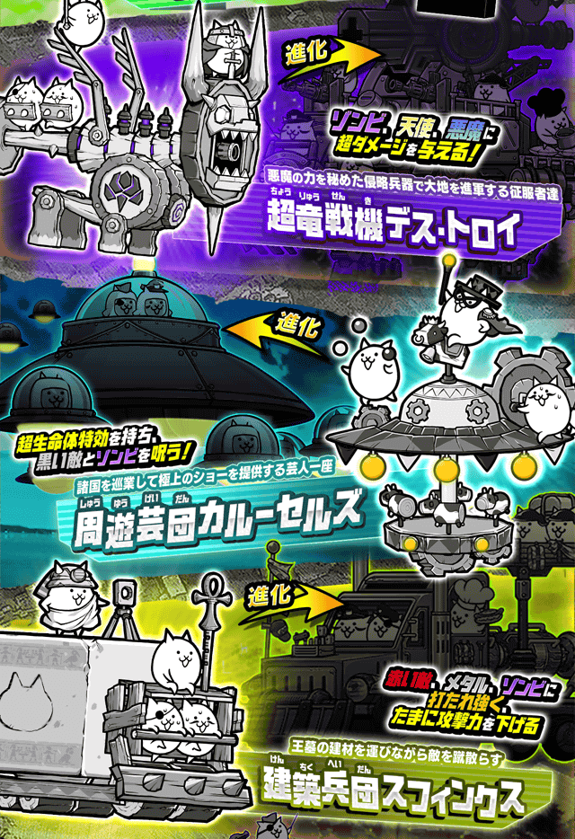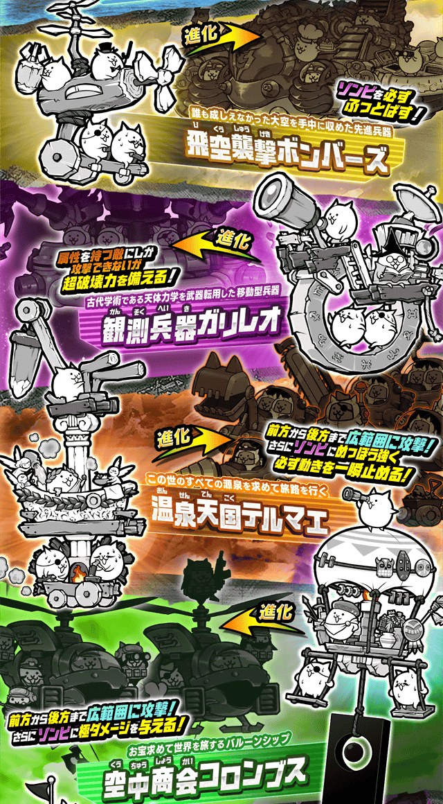 ネコホッピング、ネコ車輪、ネコエステ、ねこジュラ、ねこファイター、ねこ海賊、ねこ泥棒、ねこ僧侶、ねこ占い師、ネコシャーマン、ネコ魔女、ネコアーチャー、ネコ魔剣士、ねこガンマン、たけうまねこ、ブリキネコ、ねこロッカー、ねこ人魚、サイキックネコ、ねこ陰陽師、ネコバサミ、ネコボクサー、ネコ探査機、ネコマタドール、ネコ武闘家