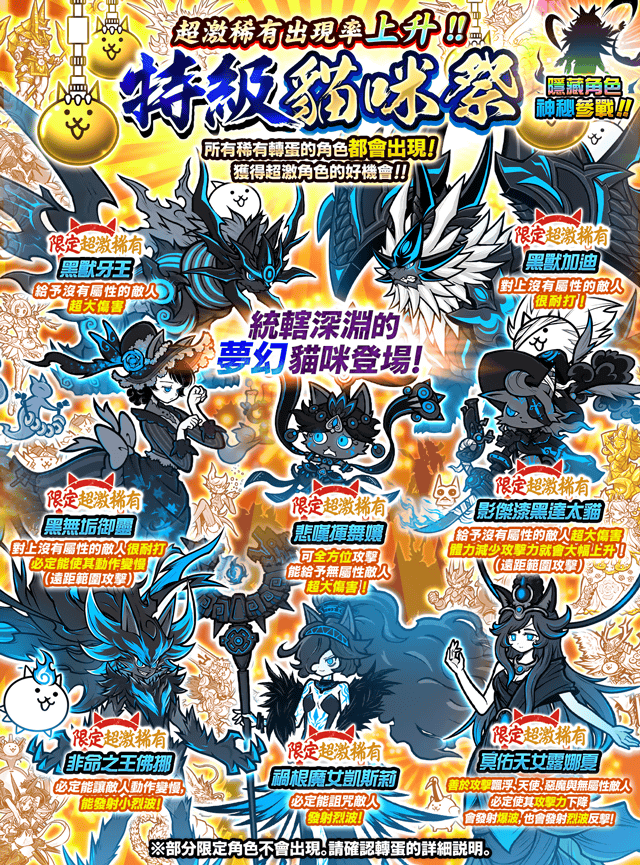 冰雪貓, 機器貓, 惡鬼喵魔, 巨劍騎士貓, 貓咪Baby, 貓護士, 貓咪鬥惡龍, 拉斯沃斯, 召喚少年小悟, 天狗貓, 噴火恐龍貓