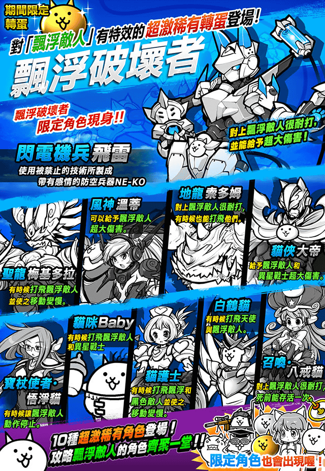 ※「超激稀有角色1隻確定活動」舉辦時,需要使用「連續轉蛋11次」的選項才會確定獲得1隻或以上的超激稀有角色。