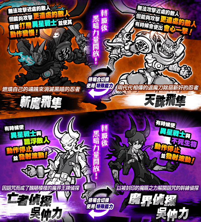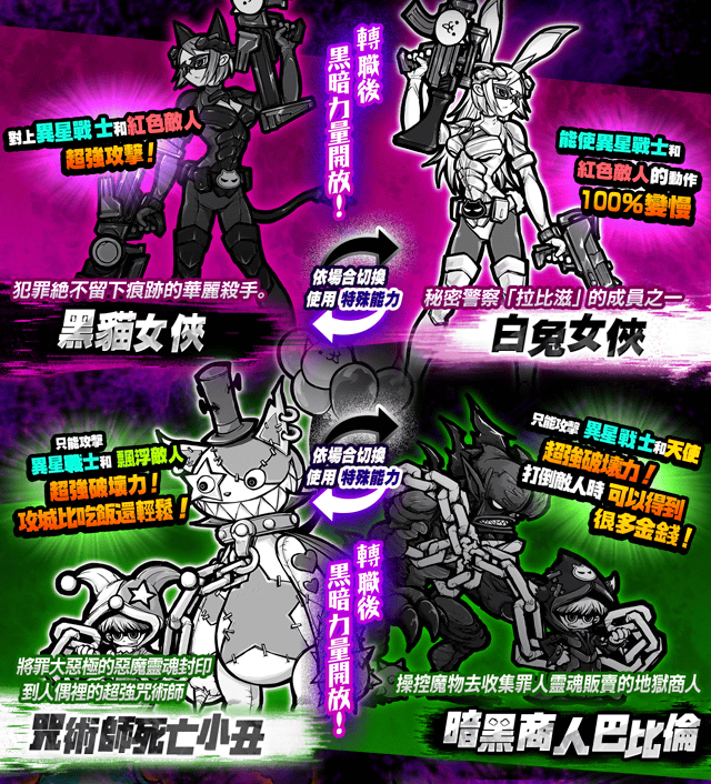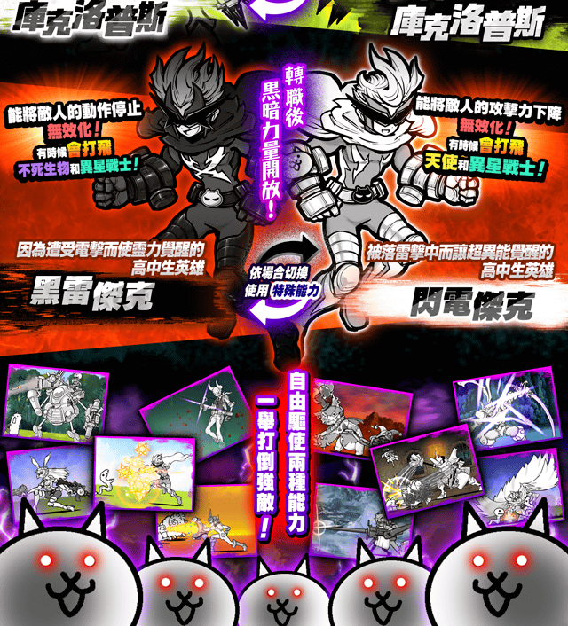 跳跳貓, 車輪貓, 美容貓, 侏羅貓, 鬥士貓, 海賊貓, 小偷貓, 僧侶貓, 占卜貓, 薩滿貓, 魔女貓, 弓箭手貓, 魔劍士貓, 神槍手貓, 高蹺貓, 發條貓, 搖滾貓, 人魚貓, 超能力貓, 貓咪陰陽師, 樹剪貓, 拳擊手貓, 貓咪探測器, 鬥牛士貓, 貓咪格鬥家