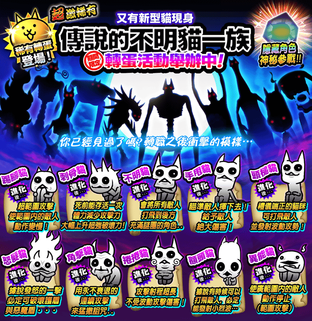 ※「超激稀有角色1隻確定活動」舉辦時,需要使用「連續轉蛋11次」的選項才會確定獲得1隻或以上的超激稀有角色。